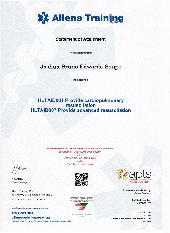 As a volunteer at Emergency Medical Response, Josh has received training through EMR and apts and currently holds HLTAID006 Provide Advanced First Aid and HLTAID007 Provide Advanced Resuscitation first aid certificates.